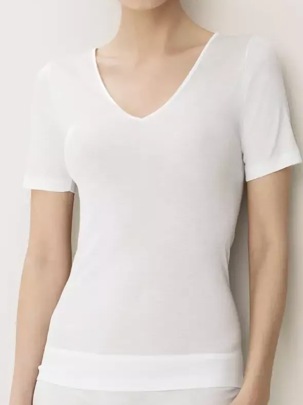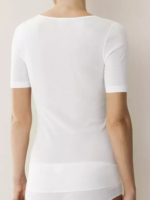 Zimmerli Damen Shirt Kurzarm aus der Serie 266 Cotton de Luxe – ein edles Shirt der Extraklasse in weiß, gefertigt aus merzerisierter und gezwirnter Baumwolle. Cotton de Luxe trägt sich besonders angenehm und bietet den Luxus einer überlegenen Qualität und exzellenten Verarbeitung. Cotton de Luxe steht für absolutes Wohlgefühl ohne Seitennaht und mit flachem Saum. Schweizer Handarbeit – akkurat verarbeitet. Verwöhnen Sie sich mit diesem Damenunterhemd, das höchsten Ansprüchen gerecht wird.